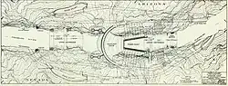 To protect the construction site from the Colorado River and to facilitate the river's diversion, two cofferdams were constructed. Work on the upper cofferdam began in September 1932, even though the river had not yet been diverted.[57] The cofferdams were designed to protect against the possibility of the river's flooding a site at which two thousand men might be at work, and their specifications were covered in the bid documents in nearly as much detail as the dam itself. The upper cofferdam was 96 ft (29 m) high, and 750 feet (230 m) thick at its base, thicker than the dam itself. It contained 650,000 cubic yards (500,000 m3) of material.[58]