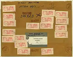 Smithsonian mineralogist George Switzer is credited with persuading jeweler Harry Winston to donate the Hope Diamond for a proposed national gem collection to be housed at the National Museum of Natural History.[54] On November 10, 1958,[18] Winston acquiesced, sending it through U.S. Mail in a box wrapped in brown paper as simple registered mail[15] insured for $1 million at a cost of $145.29, of which $2.44 was for postage and the balance insurance.[15][55] Upon its arrival it became Specimen #217868.[56]