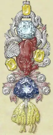 In 1749, Louis XIV's great-grandson, Louis XV, had the French Blue set into a more elaborate jeweled pendant for the Order of the Golden Fleece by court jeweler André Jacquemin.[14] The assembled piece included a red spinel of 107-carat (21.4 g; 0.75 oz) carats shaped as a dragon breathing "covetous flames," as well as 83 red-painted diamonds and 112 yellow-painted diamonds to suggest a fleece shape.[18]