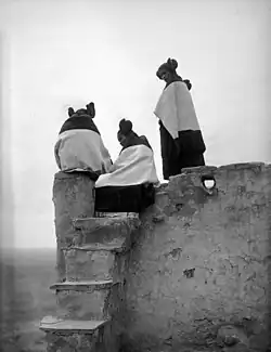 ![]() A Hopi girl with a customary Hopi butterfly whorl hairstyle, woven wearing blanket, jewelry, and an olla. | |
