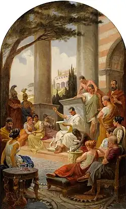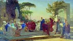 Horace left Rome, possibly after his father's death, and continued his formal education in Athens, a great centre of learning in the ancient world, where he arrived at nineteen years of age, enrolling in The Academy. Founded by Plato, The Academy was now dominated by Epicureans and Stoics, whose theories and practices made a deep impression on the young man from Venusia.[19] Meanwhile, he mixed and lounged about with the elite of Roman youth, such as Marcus, the idle son of Cicero, and the Pompeius to whom he later addressed a poem.[20] It was in Athens too that he probably acquired deep familiarity with the ancient tradition of Greek lyric poetry, at that time largely the preserve of grammarians and academic specialists (access to such material was easier in Athens than in Rome, where the public libraries had yet to be built by Asinius Pollio and Augustus).[21]