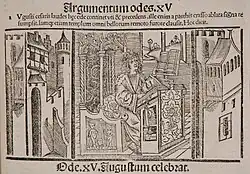 According to Suetonius, the second book of Epistles was prompted by Augustus, who desired a verse epistle to be addressed to himself. Augustus was in fact a prolific letter-writer and he once asked Horace to be his personal secretary. Horace refused the secretarial role but complied with the emperor's request for a verse letter.[56] The letter to Augustus may have been slow in coming, being published possibly as late as 11 BC. It celebrated, among other things, the 15 BC military victories of his stepsons, Drusus and Tiberius, yet it and the following letter[57] were largely devoted to literary theory and criticism. The literary theme was explored still further in Ars Poetica, published separately but written in the form of an epistle and sometimes referred to as Epistles 2.3 (possibly the last poem he ever wrote).[58] He was also commissioned to write odes commemorating the victories of Drusus and Tiberius[59] and one to be sung in a temple of Apollo for the Secular Games, a long-abandoned festival that Augustus revived in accordance with his policy of recreating ancient customs (Carmen Saeculare).