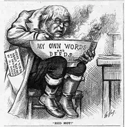 The Republican counterattack was well financed, accusing Greeley of support for everything from treason to the Ku Klux Klan. The anti-Greeley campaign was famously and effectively summed up in the cartoons of Thomas Nast, whom Grant later credited with a major role in his re-election. Nast's cartoons showed Greeley giving bail money for Jefferson Davis, throwing mud on Grant, and shaking hands with John Wilkes Booth across Lincoln's grave. The Crédit Mobilier scandal—corruption in the financing of the Union Pacific Railroad—broke in September, but Greeley was unable to take advantage of the Grant administration's ties to the scandal as he had stock in the railroad himself, and some alleged it had been given to him in exchange for favorable coverage.[115] Grant wrote of Greeley, "He is a genius without common sense'".[116]