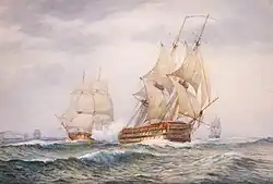 During the passage, Nelson captured the Spanish frigate Santa Sabina, and placed Lieutenants Jonathan Culverhouse and Thomas Hardy in charge of the captured vessel; taking the frigate's Spanish captain on board Minerve. Santa Sabina was part of a larger Spanish force, and the next morning two Spanish ships-of-the-line and a frigate were sighted closing fast. Unable to outrun them, Nelson was initially determined to fight, but Culverhouse and Hardy raised the British colours and sailed northeast, drawing the Spanish ships after them until being captured, giving Nelson the opportunity to escape.[103] Nelson went on to rendezvous with the British fleet at Elba, where he spent Christmas.[104] He sailed for Gibraltar in late January, and after learning the Spanish fleet had sailed from Cartagena, stopped just long enough to collect Hardy, Culverhouse, and the rest of the prize crew captured with Santa Sabina, before pressing on through the straits to join Jervis off Cádiz.[105]