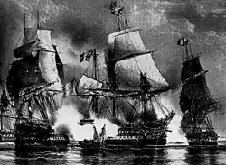 After the occupation of Corsica, Hood ordered Nelson to open diplomatic relations with the city-state of Genoa, a strategically important potential ally.[88] Soon after, Hood returned to England and was succeeded by Admiral William Hotham as commander-in-chief in the Mediterranean. Nelson put into Leghorn and, while Agamemnon underwent repairs, met with other naval officers at the port and entertained a brief affair with local Adelaide Correglia.[89] Hotham arrived with the rest of the fleet in December, whereupon Nelson and Agamemnon sailed on a number of cruises with them in late 1794 and early 1795.[90] On 8 March, news reached Hotham of the French fleet at sea heading for Corsica. He immediately set out to intercept them, and Nelson eagerly anticipated his first fleet action. The French were reluctant to engage, and the two fleets shadowed each other on 12 March. The following day, two of the French ships collided, allowing Nelson to engage the much larger 84-gun Ça Ira. This engagement went on for two and a half hours, until the arrival of two French ships forced Nelson to veer away, having inflicted heavy casualties and considerable damage.[91]