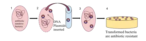 • Transformation, the genetic alteration of a cell resulting from the introduction, uptake and expression of foreign genetic material (DNA or RNA).[43] This process is relatively common in bacteria, but less so in eukaryotes.[44] Transformation is often used in laboratories to insert novel genes into bacteria for experiments or for industrial or medical applications. See also molecular biology and biotechnology.