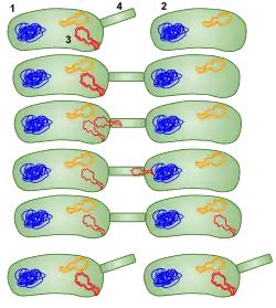 • Bacterial conjugation, a process that involves the transfer of DNA via a plasmid from a donor cell to a recombinant recipient cell during cell-to-cell contact.[43]