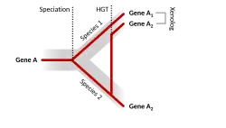 A speciation event produces orthologs of a gene in the two daughter species. A horizontal gene transfer event from one species to another adds a xenolog of the gene to the receiving genome.