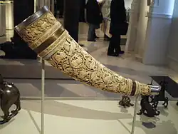 The olifant or oliphant (an abbreviation of the French cor d'olifant/oliphant, "elephant horn") was the name applied in the Middle Ages to ivory hunting or signalling horns made from elephants' tusks. Apparently of Asian origin, they reached Europe from Byzantium in the tenth or eleventh century, and are first mentioned in French literature in the early 12th century. In Europe they came to be symbols of royalty.[3]