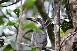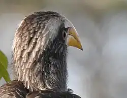 The most distinctive feature of the hornbills is the heavy bill, supported by powerful neck muscles as well as by the fused vertebrae.[3] The large bill assists in fighting, preening, constructing the nest, and catching prey. A feature unique to the hornbills is the casque, a hollow structure that runs along the upper mandible. In some species it is barely perceptible and appears to serve no function beyond reinforcing the bill. In other species it is quite large, is reinforced with bone, and has openings between the hollow centre, allowing it to serve as a resonator for calls.[1] In the helmeted hornbill the casque is not hollow but is filled with hornbill ivory and is used as a battering ram in dramatic aerial jousts.[7] Aerial casque-butting has also been reported in the great hornbill.[8][9]