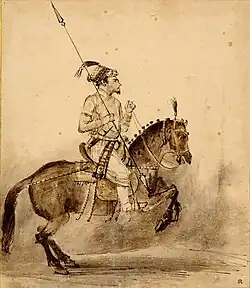 The well-bred palfrey, which could equal a destrier in price, was popular with nobles and highly ranked knights for riding, hunting and ceremonial use.[23] Ambling was a desirable trait in a palfrey, as the smooth gait allowed the rider to cover long distances quickly in relative comfort.[4] Other horse types included the jennet, a small horse first bred in Spain from Barb and Arabian bloodstock.[5] Their quiet and dependable nature, as well as size, made them popular as riding horses for ladies; however, they were also used as cavalry horses by the Spanish.[23]