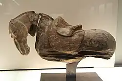 The saddle with a solid tree provided a bearing surface to protect the horse from the weight of the rider. The Romans are credited with the invention of the solid-treed saddle, possibly as early as the 1st century BC,[80] and it was widespread by the 2nd century AD.[81] Early medieval saddles resembled the Roman "four-horn" saddle, and were used without stirrups.[82] The development of the solid saddle tree was significant; it raised the rider above the horse's back, and distributed the rider's weight, reducing the pressure on any one part of the horse's back, thus greatly increasing the comfort of the horse and prolonging its useful life.[4] Horses could carry more weight when distributed across a solid saddle tree. It also allowed a more built up seat to give the rider greater security in the saddle. From the 12th century on, the high war-saddle became more common, providing protection as well as added security.[25] The built up cantle of a solid-treed saddle enabled horsemen to use lance more effectively.[54]