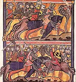 The increased use of the stirrup from the 8th century on aided the warrior's stability and security in the saddle when fighting.[89] This may have led to greater use of shock tactics, although a couched lance could be used effectively without stirrups.[54] In particular, Charles Martel recognized the military potential of the stirrup, and distributed seized lands to his retainers on condition that they serve him by fighting in the new manner.[90]