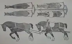 Beneath the saddle, caparisons or saddle cloths were sometimes worn; these could be decorated or embroidered with heraldic colours and arms.[83] War horses could be equipped with additional covers, blankets and armour collectively referred to as barding; this could be for decorative or protective purposes. Early forms of horse armour, usually restricted to tournaments, comprised padded leather pieces, covered by a trapper (a decorated cloth), which was not particularly heavy.[84] Mail and plate armour was also occasionally used; there are literary references to horse armour (an "iron blanket") starting in the late 12th century.[85]