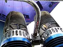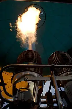 The burner unit gasifies liquid propane,[40] mixes it with air, ignites the mixture, and directs the flame and exhaust into the mouth of the envelope. Burners vary in power output; each will generally produce 2 to 3 MW of heat (7 to 10 million BTUs per hour), with double, triple, or quadruple burner configurations installed where more power is needed.[41][42] The pilot actuates a burner by opening a propane valve, known as a blast valve. The valve may be spring-loaded, so that it closes automatically, or it may stay open until closed by the pilot. The burner has a pilot light to ignite the propane and air mixture. The pilot light may be lit by the pilot with an external device, such as a flint striker or a lighter, or with a built-in piezoelectric spark.[43]