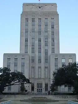 In 1900, after Galveston was struck by a devastating hurricane, efforts to make Houston into a viable deep-water port were accelerated.[33] The following year, the discovery of oil at the Spindletop oil field near Beaumont prompted the development of the Texas petroleum industry.[34] In 1902, President Theodore Roosevelt approved a $1 million improvement project for the Houston Ship Channel. By 1910, the city's population had reached 78,800, almost doubling from a decade before. African Americans formed a large part of the city's population, numbering 23,929 people, which was nearly one-third of Houston's residents.[35]