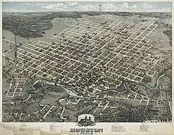 By 1860, Houston had emerged as a commercial and railroad hub for the export of cotton.[27] Railroad spurs from the Texas inland converged in Houston, where they met rail lines to the ports of Galveston and Beaumont. During the American Civil War, Houston served as a headquarters for Confederate Major General John B. Magruder, who used the city as an organization point for the Battle of Galveston.[31] After the Civil War, Houston businessmen initiated efforts to widen the city's extensive system of bayous so the city could accept more commerce between Downtown and the nearby port of Galveston. By 1890, Houston was the railroad center of Texas.[32]