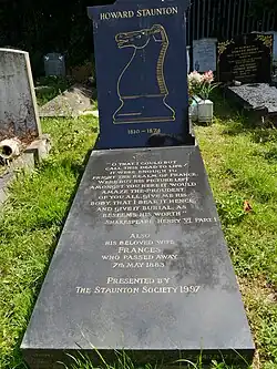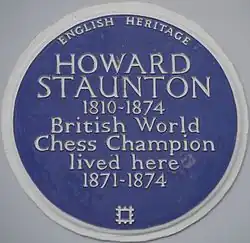 A memorial plaque now hangs at his old residence of 117 Lansdowne Road, London. In 1997 a memorial stone bearing an engraving of a chess knight was raised over his grave at Kensal Green Cemetery in London, which had previously been unmarked and neglected.[57][58]