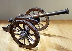 The first artillery identified as howitzers developed in the late 16th century as a medium-trajectory weapon between the low trajectory (direct fire) of cannons and the high trajectory (indirect fire) of mortars.[15] Originally intended for use in siege warfare, they were particularly useful for delivering cast iron shells filled with gunpowder or incendiary materials into the interior of fortifications. In contrast to contemporaneous mortars, which were fired at a fixed angle and were entirely dependent on adjustments to the size of propellant charges to vary range, howitzers could be fired at a wide variety of angles. Thus, while howitzer gunnery was more complicated than the technique of employing mortars, the howitzer was an inherently more flexible weapon that could fire its projectiles along a wide range of trajectories.[16]