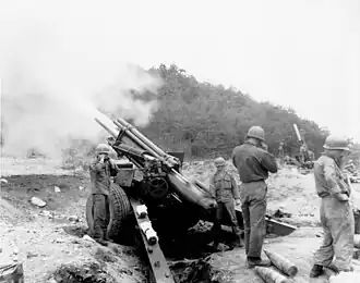![]() Firing of a 155 mm howitzer by the 90th Field Artillery Battalion, US 24th Infantry Division, during the Korean War | |