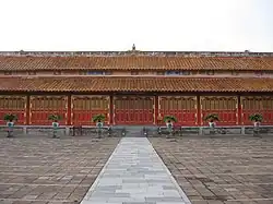 However, Tây Sơn rebellions broke out in 1771 and quickly occupied a large area from Quy Nhon to Bình Thuận province, thereby weakening the authority and power of the Nguyễn lords.[16] While the war between Tây Sơn rebellion and Nguyễn lord was being fought, the Trịnh lords sent south a massive army and easily captured Phú Xuân in 1775.[17] After the capture of Phú Xuân, the Trịnh lords' general Hoàng Ngũ Phúc made a tactical alliance with Tây Sơn and withdrew almost all troops to Tonkin and left some troops in Phú Xuân.[18] In 1786, Tây Sơn rebellion defeated the Trịnh garrison and occupied Phú Xuân.[19] Under the reign of the emperor Quang Trung, Phú Xuân became the Tây Sơn dynasty capital.[20] The Tây Sơn insurgent army conquered the Nguyễn capital after winning the battle of Phú Xuân in 1786, where they continued north and overthrew the Trinh Dynasty. In Phú Xuân, Nguyễn Huệ appointed himself king; with internal strife within the Tây Sơn Movement and the death of Nguyễn Huệ (1792), Nguyễn Ánh took advantage of the situation and conquered Gia Định with the support of foreign forces. He became attached to the Tây Sơn movement and took over Phú Xuân and the throne, thereby choosing the dynasty title of Gia Long (1802).