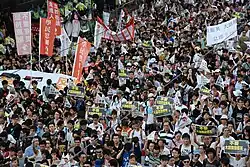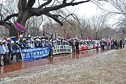 Hu was mostly conservative on political reforms during his tenure.[32] In the beginning of 2006, Hu launched the "Eight Honors and Eight Shames" movement in a bid to promote a more selfless and moral outlook amongst the population.[17] At the 17th CCP National Congress, Hu was re-elected as general secretary of the Central Committee and chairman of the CCP Central Military Commission on 22 October 2007. At the 11th National People's Congress, Hu was re-elected as president on 15 March 2008. He was also re-elected as chairman of the PRC Central Military Commission.[33]