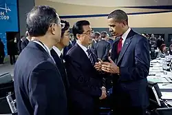 In 2006, Hu articulated the four phases of China's foreign policy developmental objectives: (1) big powers were the key, (2) periphery countries the priority, (3) developing countries the foundation, and (4) multilateralism the stage.[47] In 2009, Chinese leader Hu Jintao called for a bolstered arms control agenda at the United Nations General Assembly, joining United States President Barack Obama's earlier calls for a nuclear-free world.[50] In 2009, the first BRIC summit was held in Russia, including China, Brazil and India.[51]: 500