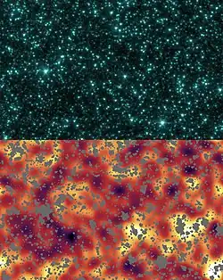 Another important result from the HDF was the very small number of foreground stars present. For years astronomers had been puzzling over the nature of dark matter, mass which seems to be undetectable but which observations implied made up about 85% of all matter in the Universe by mass.[20] One theory was that dark matter might consist of Massive Astrophysical Compact Halo Objects (MACHOs)—faint but massive objects such as red dwarfs and planets in the outer regions of galaxies.[21] The HDF showed, however, that there were not significant numbers of red dwarfs in the outer parts of our galaxy.[10][12]
