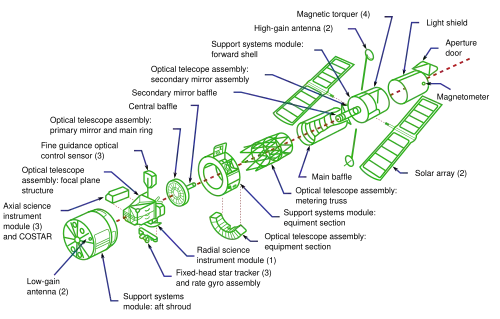 The spacecraft in which the telescope and instruments were to be housed was another major engineering challenge. It would have to withstand frequent passages from direct sunlight into the darkness of Earth's shadow, which would cause major changes in temperature, while being stable enough to allow extremely accurate pointing of the telescope. A shroud of multi-layer insulation keeps the temperature within the telescope stable and surrounds a light aluminum shell in which the telescope and instruments sit. Within the shell, a graphite-epoxy frame keeps the working parts of the telescope firmly aligned.[45] Because graphite composites are hygroscopic, there was a risk that water vapor absorbed by the truss while in Lockheed's clean room would later be expressed in the vacuum of space; resulting in the telescope's instruments being covered by ice. To reduce that risk, a nitrogen gas purge was performed before launching the telescope into space.[46]