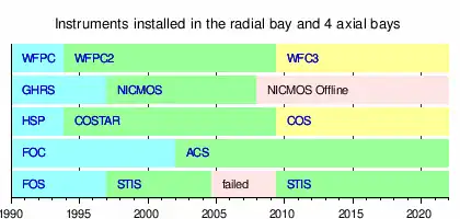 When launched, the HST carried five scientific instruments: the Wide Field and Planetary Camera (WF/PC), Goddard High Resolution Spectrograph (GHRS), High Speed Photometer (HSP), Faint Object Camera (FOC) and the Faint Object Spectrograph (FOS). WF/PC used a radial instrument bay, and the other four instruments were each installed in an axial instrument bay.[56]