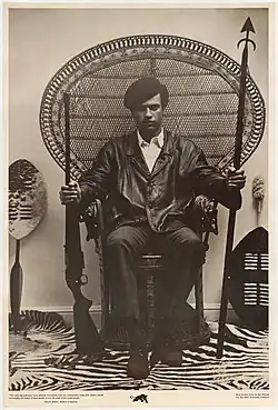 Poster with a portrait photograph of Newton sitting in a rattan throne chair while wearing a beret and holding a rifle and spear, c. 1967. In the background are Nguni shields.