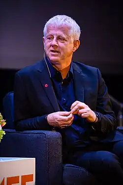 While promoting Woody Allen's Small Time Crooks (2000) on NBC's The Today Show in 2000, Grant told host Matt Lauer, "It's my millennium of bastards".[79] Small Time Crooks starred Grant, in the words of film critic Andrew Sarris, as "a petty, petulant, faux-Pygmalion art dealer, David, [who] is one of the sleaziest and most unsympathetic characters Mr. Allen has ever created".[80] In a role devoid of his comic attributes, The New York Times wrote: "Mr. Grant deftly imbues his character with exactly a perfect blend of charm and nasty calculation."[81] In 2000, Grant also joined the supervisory board of IM Internationalmedia AG, the powerful Munich-based film and media company.[82] In 2001, his turn as a charming but womanising book publisher Daniel Cleaver in Bridget Jones's Diary was proclaimed by Variety to be "as sly an overthrow of a star's polished posh – and nice – poster image as any comic turn in memory".[83] The film, adapted from Helen Fielding's novel of the same name, was an international hit, earning $281 million worldwide.[61] He was, according to The Washington Post, fitting as "a cruel, manipulative cad, hiding behind the male god's countenance that he knows all too well".[84]