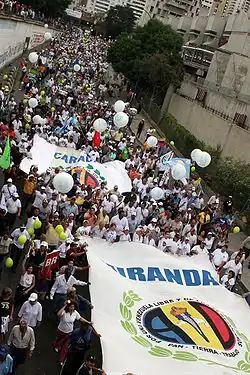 In 1989, Carlos Andrés Pérez was elected president, and though he had promised to oppose the International Monetary Fund's policies, once he got into office he enacted economic policies supported by the IMF, angering the public.[66] In an attempt to stop widespread lootings and protests that followed his spending cuts, known as El Caracazo, Pérez initiated Plan Ávila, a military contingency plan by the Venezuelan Army to maintain public order, and an outbreak of violent repression unfolded.[67][68] Though members of Chávez's MBR-200 movement allegedly participated in the crackdown,[69] Chávez did not, since he was then hospitalized with chicken pox. He later condemned the event as "genocide".[70]
