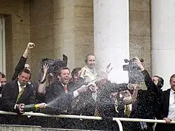 The next campaign was a lot less comfortable. The relationship between the club's supporters and Lloyd had soured following the unveiling of plans to move the Tigers back to the Boulevard after nearly a century away.[36] Furthermore, Lloyd also wanted to merge City and F.C. together to generate more income, a proposal that did not sit well with either fanbase. In a League Cup fixture away at Bolton Wanderers on 15 September 1998, Hull's travelling fans threw tennis balls onto the pitch to delay the game and show their disapproval for how their club was being run. This is often cited as the first instance of a tennis ball protest in football.[36] The club was eventually sold in November 1998, although Lloyd retained ownership of Boothferry Park. The new owners were a consortium from Sheffield, and headed by businessman Nick Buchanan.[35][40] Their first decision was to sack Hateley, and promote the now 34-year-old Joyce to replace him as player-manager.[35][41] When Joyce took over, the club were rooted to the bottom of the Football League.[41] After a hard-fought second half of the campaign, they avoided the drop by five points.[42] As a result, the 1998–99 season is now referred to as "the Great Escape" by supporters.[43]