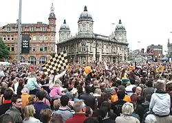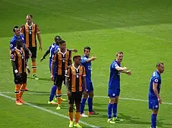 Bruce stayed in spite of relegation and largely managed to keep the same squad going into the 2015–16 season. After the 2–0 victory away at Brentford on 3 November 2015, Hull found themselves atop of the Championship table.[187] This came a week after their League Cup penalty-shootout win over eventual Premier League champions Leicester City,[188] which took the Tigers to their first-ever quarter-final appearance in the competition.[189][190] That appearance, on 1 December 2015, saw Manchester City beat Hull 4–1 at the Etihad Stadium.[191] Coincidentally, the Citizens would go on to win the cup later that season.[192] Hull would also taste glory in the 2015–16 campaign, overcoming Derby County 3–2 on aggregate in the semi-finals of the Championship play-offs.[193] In the final, on 28 May 2016, a long-range effort from Diamé was enough to beat Sheffield Wednesday, securing the Tigers an immediate return to the top-flight.[194]