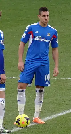 Following promotion, Bruce set about improving the squad so it was fit to compete in the Premier League. He started by making the loans of Elmohamady and George Boyd permanent,[153][154] before signing Maynor Figueroa,[155] Allan McGregor,[156] and Tom Huddlestone[157] throughout the summer transfer window, among others. Furthermore, Jake Livermore, who had made his England debut the previous year, was loaned in for the entirety of the 2013–14 campaign.[157] The Tigers began the season slowly, but there were clear signs of progress. A 3–1 home victory over title-chasing Liverpool on 1 December 2013,[158] and a narrow 3–2 defeat to Manchester United a few weeks later,[159] put Hull in a good position for their upcoming home fixture against Fulham. On 28 December 2013, Hull recorded their biggest-ever Premier League win, thrashing the visitors 6–0 and lifting them into 10th place.[160] The game is well-remembered for Huddlestone celebrating his goal (Hull's fourth), by cutting a lock of his hair for charity having promised to grow it out until his next goal.[161] The promise had lasted two years, as Huddlestone had not scored since 20 April 2011, when playing for his old club, Tottenham Hotspur, in their 3–3 draw with arch-rivals Arsenal.[162]