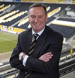 Ahead of the 1982–83 season, Hull were saved from their financial troubles. Don Robinson, a businessman who had made his money as a promoter of professional wrestling, bought a majority stake in the club.[18] Robinson arrived having been chairman of Scarborough, and brought the non-league side's manager, Colin Appleton, in as Smith's permanent replacement.[19][20] That season may have seen big changes amongst the backroom staff, but on the field Hull relied on their own talents to turn things around. The early 1980s had seen a new crop of young players break into the first team, with most of them going on to do great things in football. Winger Brian Marwood made an appearance for England in 1988,[21] whilst midfielder Steve McClaren would manage the national side between 2006 and 2007.[22] Elsewhere, the Tigers' efficient strike partnership of notorious hard man Billy Whitehurst and creative veteran Les Mutrie had become feared throughout the Football League.[23][24] Additionally, local lad Garreth Roberts captained the side from midfield as Hull earned promotion with a 2nd-placed finish.[25]