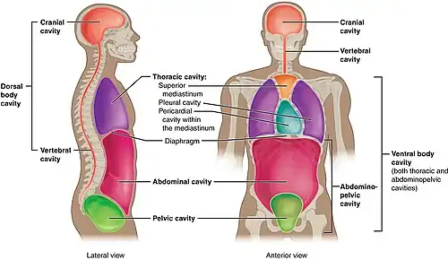The body consists of a number of body cavities, separated areas which house different organ systems. The brain and central nervous system reside in an area protected from the rest of the body by the blood brain barrier. The lungs sit in the pleural cavity. The intestines, liver, and spleen sit in the abdominal cavity.