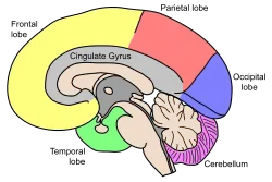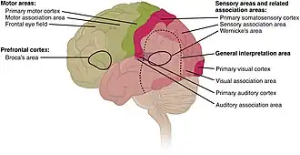 The cortex is mapped by divisions into about fifty different functional areas known as Brodmann's areas. These areas are distinctly different when seen under a microscope.[22] The cortex is divided into two main functional areas – a motor cortex and a sensory cortex.[23] The primary motor cortex, which sends axons down to motor neurons in the brainstem and spinal cord, occupies the rear portion of the frontal lobe, directly in front of the somatosensory area. The primary sensory areas receive signals from the sensory nerves and tracts by way of relay nuclei in the thalamus. Primary sensory areas include the visual cortex of the occipital lobe, the auditory cortex in parts of the temporal lobe and insular cortex, and the somatosensory cortex in the parietal lobe. The remaining parts of the cortex are called the association areas. These areas receive input from the sensory areas and lower parts of the brain and are involved in the complex cognitive processes of perception, thought, and decision-making.[24] The main functions of the frontal lobe are to control attention, abstract thinking, behaviour, problem-solving tasks, and physical reactions and personality.[25][26] The occipital lobe is the smallest lobe; its main functions are visual reception, visual-spatial processing, movement, and colour recognition.[25][26] There is a smaller occipital lobule in the lobe known as the cuneus. The temporal lobe controls auditory and visual memories, language, and some hearing and speech.[25]