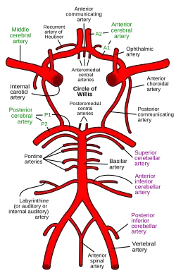 The internal carotid arteries supply oxygenated blood to the front of the brain and the vertebral arteries supply blood to the back of the brain.[55] These two circulations join in the circle of Willis, a ring of connected arteries that lies in the interpeduncular cistern between the midbrain and pons.[56]