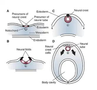 Neural crest cells (derived from the ectoderm) populate the lateral edges of the plate at the neural folds. In the fourth week—during the neurulation stage—the neural folds close to form the neural tube, bringing together the neural crest cells at the neural crest.[67] The neural crest runs the length of the tube with cranial neural crest cells at the cephalic end and caudal neural crest cells at the tail. Cells detach from the crest and migrate in a craniocaudal (head to tail) wave inside the tube.[67] Cells at the cephalic end give rise to the brain, and cells at the caudal end give rise to the spinal cord.[68]