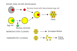 Therapeutic cloning would involve cloning cells from a human for use in medicine and transplants. It is an active area of research, and is in medical practice over the world. Two common methods of therapeutic cloning that are being researched are somatic-cell nuclear transfer and (more recently) pluripotent stem cell induction.