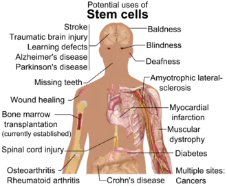 Cells produced with SCNT, or iPSCs could eventually be used in stem cell therapy,[27] or to create organs to be used in transplantation, known as regenerative medicine. Stem cell therapy is the use of stem cells to treat or prevent a disease or condition. Bone marrow transplantation is a widely used form of stem cell therapy.[28] No other forms of stem cell therapy are in clinical use at this time. Research is underway to potentially use stem cell therapy to treat heart disease, diabetes, and spinal cord injuries.[29][30] Regenerative medicine is not in clinical practice, but is heavily researched for its potential uses. This type of medicine would allow for autologous transplantation, thus removing the risk of organ transplant rejection by the recipient.[31] For instance, a person with liver disease could potentially have a new liver grown using their same genetic material and transplanted to remove the damaged liver.[32] In current research, human pluripotent stem cells have been promised as a reliable source for generating human neurons, showing the potential for regenerative medicine in brain and neural injuries.[33]