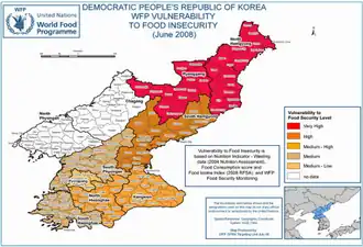 A UN human rights office report released in May 2019 highlighted the "appalling" levels of hunger that have been affecting around 10.9 million people particularly in north-eastern and rural provinces of North Korea.[103] UN High Commissioner for Human Rights, Michelle Bachelet said, "The rights to food, health, shelter, work, freedom of movement and liberty are universal and inalienable, but in North Korea they depend primarily on the ability of individuals to bribe State officials."[104]