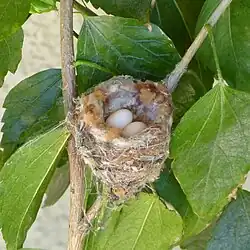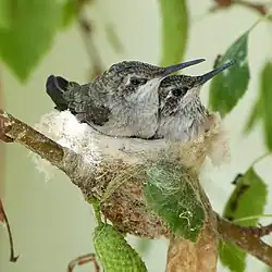 Hummingbird females build a nest resembling a small cup about 1.5 inches (3.8 cm) in diameter, commonly attached to a tree branch using spider webs, lichens, moss, and loose strings of plant fibers (image).[15][16] Typically, two pea-sized white eggs (image) – the smallest of any bird – are incubated over 2–3 weeks in breeding season.[15][16] Fed by regurgitation only from the mother, the chicks fledge about 3 weeks after hatching.[16][27]