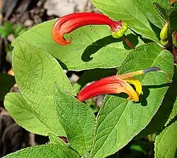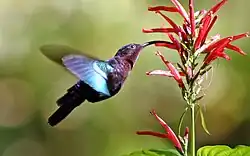 Hummingbirds and the plants they visit for nectar have a tight coevolutionary association, generally called a plant–bird syndrome or mutualistic network.[57][58][64] By collecting pollen on their beaks while foraging from flowers, hummingbirds contribute to flower species diversification and morphology adaptations – hummingbirds prefer bright red, yellow or purple flowers having no scent or landing platform, and with long corolla tubes containing copious nectar, characteristics unfavorable to insect pollinators.[57][58][60]