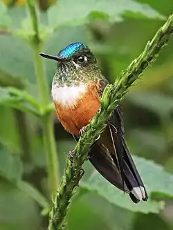 The greatest species richness is in humid tropical and subtropical forests of the northern Andes and adjacent foothills, but the number of species found in the Atlantic Forest, Central America or southern Mexico also far exceeds the number found in southern South America, the Caribbean islands, the United States, and Canada.[3][4] While fewer than 25 different species of hummingbirds have been recorded from the United States and fewer than 10 from Canada and Chile each,[4][35] Colombia alone has more than 160[36] and the comparably small Ecuador has about 130 species.[37]