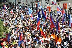 After the July 2013 general elections both Hun Sen and his opponents Cambodia National Rescue Party claimed victory. In August, Hun Sen continued to pursue his aim of forming a new government.[46] Cambodians in the United States, Canada and elsewhere, with hundreds of Buddhist Monks, peacefully protested in front of the United Nations in New York City on 19 August in opposition to Hun Sen's deployment of military and security forces in Phnom Penh, his unwillingness to share political power with opposition groups and seriously address earlier voting fraud and election irregularities.[47]