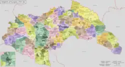 The "H" in the name of Hungary is most likely derived from historical associations with the Huns, who had settled Hungary prior to the Avars.[34] The rest of the word comes from the Latinised form of Byzantine Greek Oungroi (Οὔγγροι). The Greek name might be borrowed from Old Slavonic ągrinŭ, in turn borrowed from Oghur-Turkic Onogur ('ten [tribes of the] Ogurs').[35] Onogur was the collective name for the tribes who later joined the Bulgar tribal confederacy that ruled the eastern parts of Hungary after the Avars.[36][37] Peter B. Golden also considers the suggestion of Árpád Berta that the name derives from Khazar Turkic ongar (oŋ "right", oŋar- "to make something better, to put (it) right", oŋgar- "to make something better, to put (it) right", oŋaru "towards the right") "right wing". This points to the idea that the Magyar Union before the Conquest formed the "right wing" (western wing) of the Khazar military forces.[38]