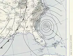![]() Surface weather analysis of Hurricane Hazel near peak intensity and landfall in North Carolina on October 15 | |